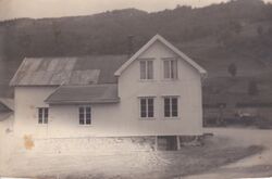 Etter hvert som handelslaget vokste gjennomgikk den opprinnelige smørstua flere ombyggings- og påbyggingsprosesser. Slik så butikken ut ved inngangen til 1930-åra. Foto: Ukjent