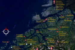 Satellittbilde av storparten av Nordmøre og Sør-Fosen med «finn»-namn markert.