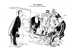 Paul Alm (til venstre) var Vestre Totens representant under åpningen av Gjøvik-utstillinga i 1910. Bladet Vikingen har her karikert hvordan utstillingas akvarium «åpnes». Vanntrykket var for hardt, slik at glasset sprakk.