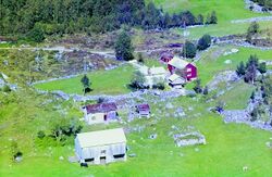Stoga var lita. Attmed gangen var tilbygd ei bu. På skjeldtilet oppå stoga var det sengerom utan vindaugo. Elles var her ei endå mindre løe med tilbygd fjos utan mykkjellar under. Husa låg på ein liten flate innunder fjellet. Utom denne er der ein stupbratt hamar ned mot vatnet. Fjosåkeren, der dei dyrka korn og jordeple, gjekk heilt fram på stupet. Det fortelst at dei laut tjore småungane, for å hindre at dei skulle gå seg utfor.