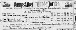 Annonse for sommerens rutetider for dampskipet Bundefjorden, 1874. Anløpsstedene var Brevik, Haslum, Presteskjær, Sørbystrand og Hellvik på vestsida av fjorden og Svartskog, Rødsten og Bekkensten på østsida av fjorden i tillegg til Malmøykalven i Aker.