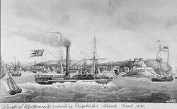 «Prospekt af Christiansands Vesterside og Dampschibbet Prinds Carl 1830». Prinds Carl var noe større enn Constitutionen og hadde på en tur til Danmark med 400 passasjerer.
