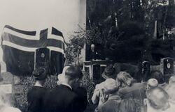 Avduking av minnestøtte (1946) over dikterpresten Jens Zetlitz ved Kviteseid gamle kyrkje.