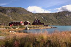 Eidsbugarden ved innsjøen Bygdin, Vang i Valdres. Foto: Leif-Harald Ruud (2019) Kart over Valdres, med den historiske vandreruta Stølsrute teikna inn.
