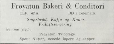 Annonsa til Frøyatun Bakeri & Conditori frå 1954.