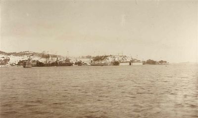 Framnæs i 1929. Det kantrete skipet er hvalkokeriet «Pythia». Arbeidere hadde fjernet plater i siden av skipet forut, men deretter trimmet feil slik at vann fosset inn. Skipet la seg over på siden over hvalbåten «Thordr». Begge ble reparert og «Pythia» ble solgt til Hvalfanger A/S Afrika og døpt om til «Ready».