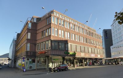 Da gjenoppbyggingen startet ble nr. 9 del av et større forretningsbygg som også omfattet Fredrik Langes gate 3, 5 og 13. Av leietakerne kan nevnes: Forenede forsikring leide lokaler her fra 1973-83. Kom fra Storgata 26 og flyttet til Storgata 92. I. Austad A/S, jernvarehus, (1977/86), rekl.kons. Christen Ringdal, Hanne Ringdal, (1977/82), Nasjonalhjelpens Fond for krigens ofre, Tromssekr., (1982/86), Tromsø trygdekontor, (1977/96), Universitetet i Tromsø, administrasjonen, (1977/86), Universitetsforlaget, (1977), fysioterapeut Einar Jaklin, (1986), Aune Forlag A/S, (1990), Tromsø lag av LHL, (1993/96), psykolog Reidun Thunes, (1996).
