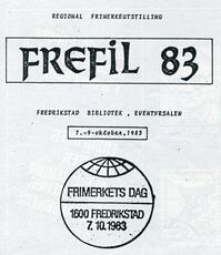 I tidsrommet 7.-9. oktober 1983 var det igjen duket for en regional frimerkeutstilling i Fredrikstad. Denne gang var det bibliotekets Eventyrsal i 2. etasje som ble benyttet som utstillingslokale. En stor og slitsom jobb ble utført for å få utstillingsrammene opp og ned trappene. Men når alt var på plass var det 9 eksponat i utstillingsklassen og ett innbudt eksponat som gledet de besøkende gjennom helga.