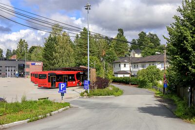 Parti fra Furuveien i Bærum med bussgarasjen på Furubakken til venstre.