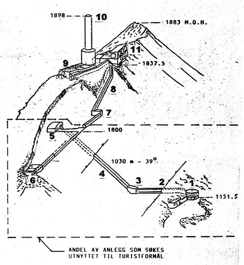 Så kom den forløsende ideen som ifølge historien ble unnfanget over et glass øl eller to på Holbergstuen i Bergen: «Hvorfor ikke gjøre som kraftutbyggerne, lage en tunnel med bane til toppen?» Det hadde foregått en stor kraftutbygging i Rjukanområdet over mange år, og entreprenørene hadde derfor meget god erfaring med skråsjakter for trykkrør, som på Måranlegget, med en lengde på 1250 m, en trapp på 3875 trinn med en parallell trallebane.