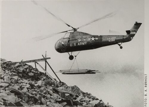 På grunn av anleggets karakter som et nøkkelpunkt i det militære sambandet i Sør-Norge som var under utbygging, og de militære krav om å få anlegget ferdig snarest mulig, dette var midt under den «kalde krigen», ble det bestemt at anleggsdriften skulle gjenopptas ved hjelp av helikoptertransport mellom nedre innslag og anleggene på toppen. Fem store H-34 Sikorsky helikoptre fra US Army i Vest-Tyskland ble i løpet av få dager stilt til rådighet for transport av byggematerialer fra Langefonn til toppen. Heldigvis for prosjektet så de militære på dette som en øvelse, og anlegget ble belastet bare med mindre lokale kostnader som drivstoff og støtte fra entreprenøren. De sørget for at sikringsarbeidene kunne komme i gang i permafrostsonen.