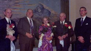 Gausvik Samvirkelag feiret sitt 25-årsjubileum der laget ble stiftet; i Gausvik krets forsamlingshus. Fra venstre: Tidligere styreleder Henry Bendixsen (1957-58), Jarle Johansen (byggeleder for nybygg 1969), tidl. styremedlem Elise Hartviksen. Tidl. styreleder Hartløf Hartløfsen (1964), og styreleder Harry Storhaug ( 1974- 78) (Foto: Viktor Kristensen) |
