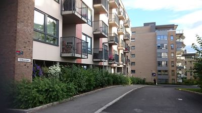 Nr. 18: Nedgangen til Løren stasjon fra Peter Møllers vei. Gildevangen går mot høyre mellom nedgangen og blokkene bak.