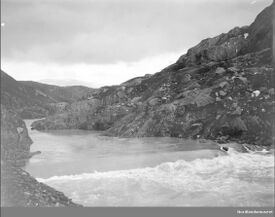 - Det nyoppførte kraftverket med rørgate og det provisoriske kraftverket i forgrunnen.Foto: Bernt Lund/Nordlandsmuseet (1920).