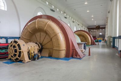 Aggregatene er horisontale og har peltonturbiner, levert av det tyske selskapet J.M. Voith. Turbinene har hver to turbinhjul med én dyse på hvert hjul. Hulene på skovlene har en ytre diameter på 3,4 meter.