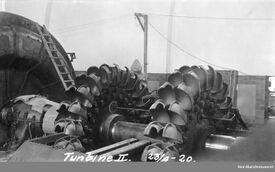 - Montering av peltonturbinene, de karakteristiske skovlehulene på denne turbintypen har en ytre diameter på 3,4 meter.Foto: Bernt Lund/Nordlandsmuseet (1920).