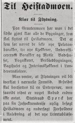 Faksimile fra Kongsberg Adresse 13. september 1909: notis om flyttingen av bygninger fra Gråtenmoen til Heistadmoen; Paa Graatenmoen har man i det sidste gjort klar alle de bygninger, som skal flyttes til Heistadmoen.