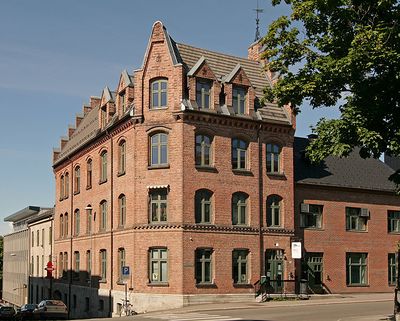 | 11 | Bygningen med karakteristisk «frontispis» er fra 1896, og ble tegnet av senere murmester Oscar Martin Røhne.[6] Lokalene tilhører i dag Fagforbundet. | |