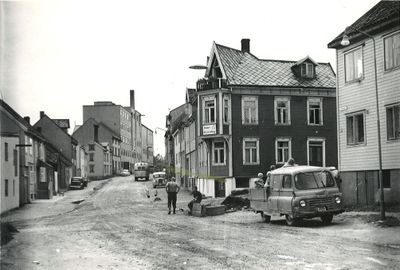 Begynnelsen av Grønnegata sett mot sør i 1960. I høyre billedkant nr. 30, på motsatt hjørne er nr. 28 med Dagny Pedersens damefrisersalong. I bakgrunnen til venstre ligger Macks bryggeri.