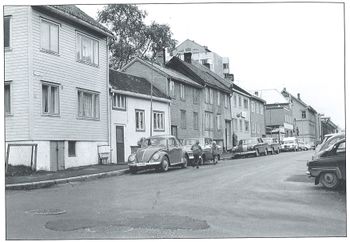 Rundt 1970 var Grønnegata 30-46 fremdeles sitt gamle jeg. Nr. 38 er hus nr. fem fra venstre, med skilt oppe på veggen.