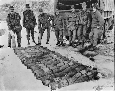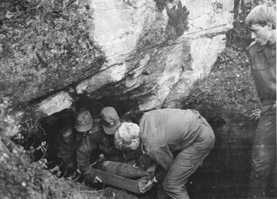 20. oktober 1986 ankom sprengstoffekspertene fra Bjerkvik for å rydde opp i sprengstoffet, som hadde ligget der uten noens kjennskap og som nå, til lokalbefolkningens store lettelse, skulle fjernes. Soldatene var ledet av kaptein Knut Andreassen fra Harstad. Etter å ha utvidet tunnelåpningen ved å fjerne betongstein og annet materiale, ble 82 sprenggranater, etter hvert løftet fram gjennom tunnelåpningen. Vel framme «i dagen» konstaterte kaptein Andreassen at granatene, som i det vesentlige var produsert på Skoda-fabrikkene i Tsjekkoslovakia, var fullt brukbare. Det ga i sin tur støtet til at 10 av de mer enn 60 kilos granatene ble sendt til marinemuseet i Horten, hvor de fortsatt skal befinne seg.