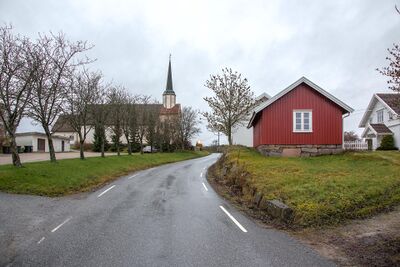 Grimstadveien med Torsnes kirke i bakgrunnen.