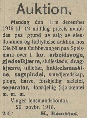 Maren døde 1913 i Gubbevangen, og i 1917 kjøpte Ole og Marthea bruket Digerud gnr. 29/12 i Vinger og bosatte seg der etter å ha solgt Gubbevangen til Mads Wiel Stang på Lier gard og det meste av løsøre på auksjon. Ole døde på Digerud i 1944.