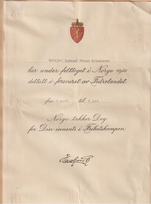 Deltakermedalen med diplom tildelt sersjant Gudmund Jørgen Eliseussen for deltakelse fra 9. april til 9. juni 1940