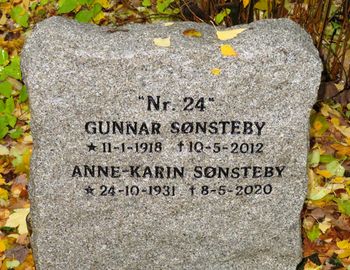 Gunnar Sønsteby er gravlagt sammen med sin kone på Vestre gravlund i Oslo. Gravminnet har påskriften "Nr. 24".