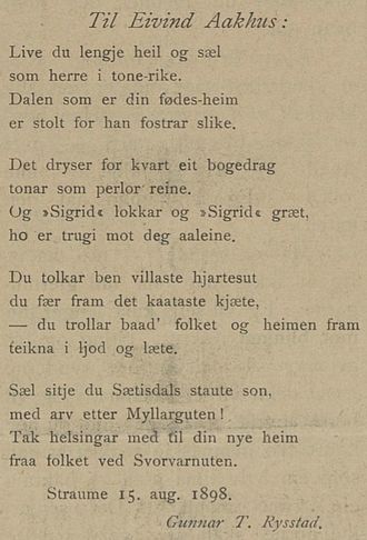 «[...] nu holder jeg denne maanedlange Forfølgelse av Gunnar Rysstad ikke længer ud. Er det en Forbrydelse at være Venstremand, men finde det umuligt at stemme sammen med sit Parti, da ikke det, men Modparten har det Program, som tykkes det beste [...] ja, saa er vi Forbrydere allesammen, og en saa uhyrlig Følgeslutning burde bringe selv en Fanatiker til at gaa bagover. [...] For at bevare mit gode Omdømme om Dem, har jeg maattet avstaa fra at læse Dem! [...] Nu maa vel Tiden være kommet, at vi slipper ud av Personforfølgelsens Ørkensand og kommer over paa fast, frugtbar Grund igjen.»