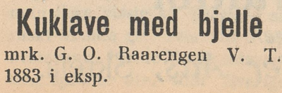 I 1930, ni år etter at Gustav Rårengen døde, ble det funnet ei kuklave med bjelle som hadde tilhørt han. Den kunne hentes i Totens Blads ekspedisjon. Klippet er fra avisas utgave den 1. juli 1930.