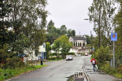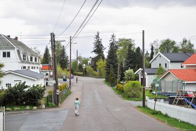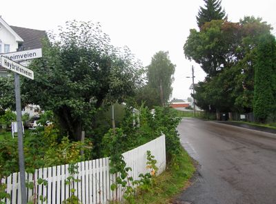 Høybråtenveien i Lørenskog kommune, ved grensa til Oslo kommune. Bak ses Lørenskog stasjon.