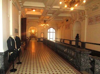 Alle etasjene har gjennomgående korridorer i hele bygningens lengde og forbundet med trappeløp med stukk og malt marmorering i hver ende i siderisalittene, i tillegg til det monumentale trappeanlegget midt i bygningen. Vinduer og dører har eikerammer med utskjæringer av høy håndverksmessig kvalitet.