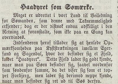 »Haadyret er et gammelt seilingsmerke og fjellnut mellom Rekefjord og Egersund. Haadyret er en karakteristisk fjellnut mot havet, merket med en stor hvit flekk slik at den er synlige langt til havs for å sikre farleden. Det hvite seilingsmerket har vært vedlikeholdt av kystverket fram til for noen få år siden.