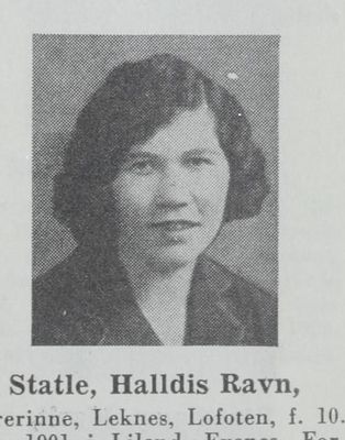 Halldis Ravn Statle, født 10. januar 1901 i Liland, Evenes kommune, død 30. mars 1988, Leknes var lærer. Hun tok eksamen ved Tromsø lærerskole i 1923 og var lærerinne i Bjørnskinn 1923-1924, Hillesøy 1924-1931, og flere steder i Buksnes kommune fra 1939. Halldis ble gift med skolestyrer og skoleinspektør Trygve Statle og familien bodde i Leknes.