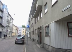 - Nr. 14: Hjørnegård mot Kirkeveien, og denne delen har adresse hit som nr. 69. Oppført 1928, arkitekt Ragnvald Tønsager.