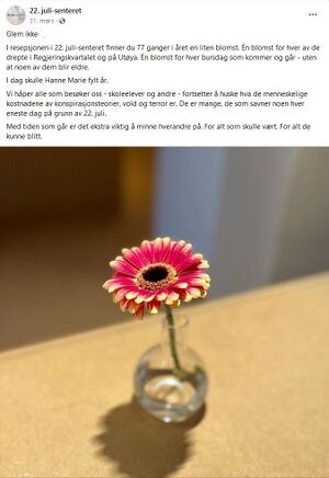 I resepsjonen i 22. juli-senteret finner du 77 ganger i året en liten blomst. Én blomst for hver av de drepte i Regjeringskvartalet og på Utøya. Én blomst for hver bursdag som kommer og går - uten at noen av dem blir eldre. I dag skulle Hanne Marie fylt år. Vi håper alle som besøker oss - skoleelever og andre - fortsetter å huske hva de menneskelige kostnadene av konspirasjonsteorier, vold og terror er. De er mange, de som savner noen hver eneste dag på grunn av 22. juli. Med tiden som går er det ekstra viktig å minne hverandre på. For alt som skulle vært. For alt de kunne blitt. | ||