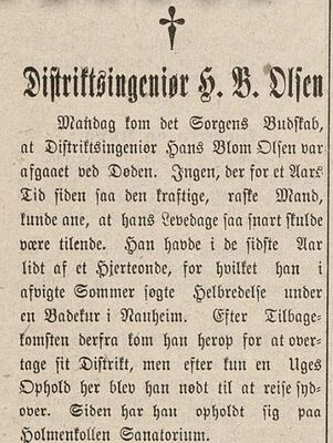 - ↑ A.A. (3. oktober 1906): Driftsingeniør H. B. Olsen, Nordlandsposten, s. 2