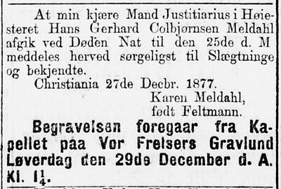 Hans Gerhard Colbjørnsen Meldahl er gravlagt i familiegrav på Vår Frelsers gravlund i Oslo.