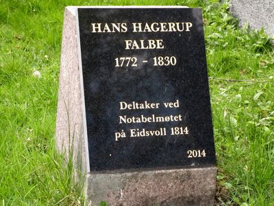 Hans Hagerup Falbe er gravlagt på Vår Frelsers gravlund i Oslo, hvor det i jubileumsåret 2014 ble satt opp en erstatningsstein for det opprinnelige gravminnet.