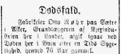 I folketellingen for Drammen i 1875 er Røhr oppført med Nedre Bragernæs som bosted. Som yrke er oppført Driver Kjex og Dropsfabrik, samt Bageri. Fabrikeier.