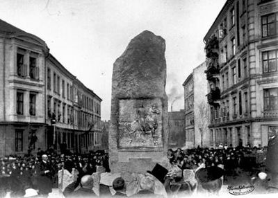En granittbauta, smykket med bronserelieff av kong Harald Hårdråde utført av Lars Utne, ble avduket på plassen 25. oktober 1905, forøvrig dagen før den svenske Riksdagen formelt anerkjente den norske selvstendigheten. I sin aftenutgave dagen etter refererte Aftenposten fra professor Yngvar Nielsens tale ved avdukningen (utdrag):