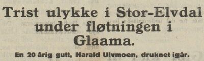 Noen rimelig forklaring på den sørgelige ulykke er vanskelig å finne. På det sted hvor Ulvmoen arbeidet var det nemlig grundt yann i elva. Det kan jo imidlertid tenkes at han har stått like ved elvekanten og dratt tømmeret uti. Taket i stokken kan så plutselig ha glippet slik at han har stupt baklengs uti elva. Ulykken gjorde naturligvis et forstemmende inntrykk på arbeidskameratene, det så meget mer som Ulvmoen var en meget flink og avholdt gutt.