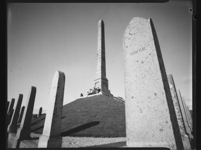 Forretningsmannen Ludolf Eide i Haugesund presenterte i 1863 ideen om å reisa eit minnesmerke over Harald Hårfagre i samband med 1000-års markeringa av slaget i Hafrsfjord. 872 var det offisielle årstalet for slaget (dei fleste historikarar vil vel no tidfesta det meir omtrentleg til ein gong i siste del av 800-talet). Arbeidet til den første jubileumskomiteen stoppa snart opp, men ein ny komite etablert i 1869 fekk fart i prosjektet. Pengar vart samla inn, og arkitekt Christian Christie laga to utkast til monument. Vinnarutkastet viste ein obelisk omgitt av 29 steinar som symboliserte dei fylka ein meinte Harald hadde samla. Det endelege monumentet vart endra noko, mellom anna ved at obelisken stod på ein jordhaug i staden for på eit trappearrangement.