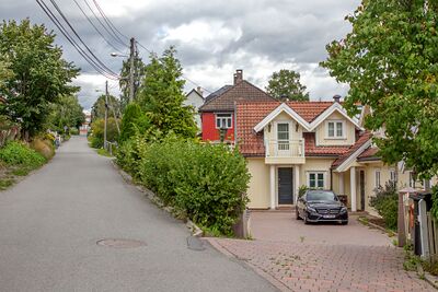 Parti fra Harreschous vei på Evje i Bærum. Valler videregående skole skimtes i enden av veien.