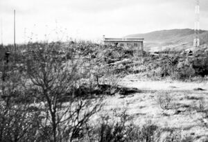 Marinefunkstelle Harstad som ble etablert i Kaarbøåsen av den tyske okkupasjonsmakten sommeren 1940, ble overtatt av Telegrafverket i september 1945. Bildet viser noe av det som ble stående etter at Harstad Radio flyttet til toppen av Harstadåsen i 1948. Vi ser den tyske senderbrakka med en garasje foran. Fotograf Steinar Pedersen står i 2. etasje i boligen som far Sigurd Pedersen oppførte og flyttet inn i høsten 1949. Foto fra 1965.