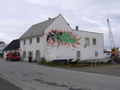 Grafittien på veggen ble laget av grafittikunstner André Eriksen, utført som en del av Festspillene i Nord-Norge 2005. Eriksen kommer fra Stovner i Oslo og begynte med graffiti i 1989. Siden har han vært innom alle aspekter av fenomenet, fra å male ulovlig på T-baner og bli fengslet til å få godt betalte jobber for store firmaer og tv-selskaper. Graffitiprosjektet i Harstad var et samarbeid mellom Festspillene i Nord-Norge, Harstad kunstforening, Pl@stelin@ - Ungdommens hus og et kunstprosjekt kalt SKINN.