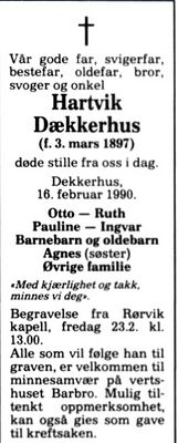 Faksimile fra Trønder-Avisa 17. februar 1990: dødsannonse for Hartvik Dækkerhus.
