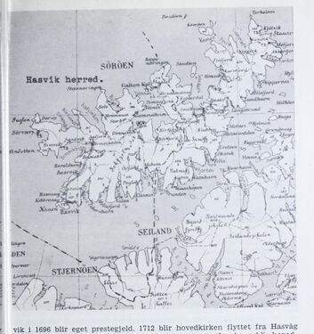 Kart over Hasvik kommune. Det Norske næringsliv. 13 : Finnmark fylkesleksikon, 1952.