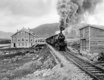 - Haugastøl stasjon ved Sløtfjorden.Foto: Jørgen Grundtvig Olsen/Nasjonalbiblioteket (1912).